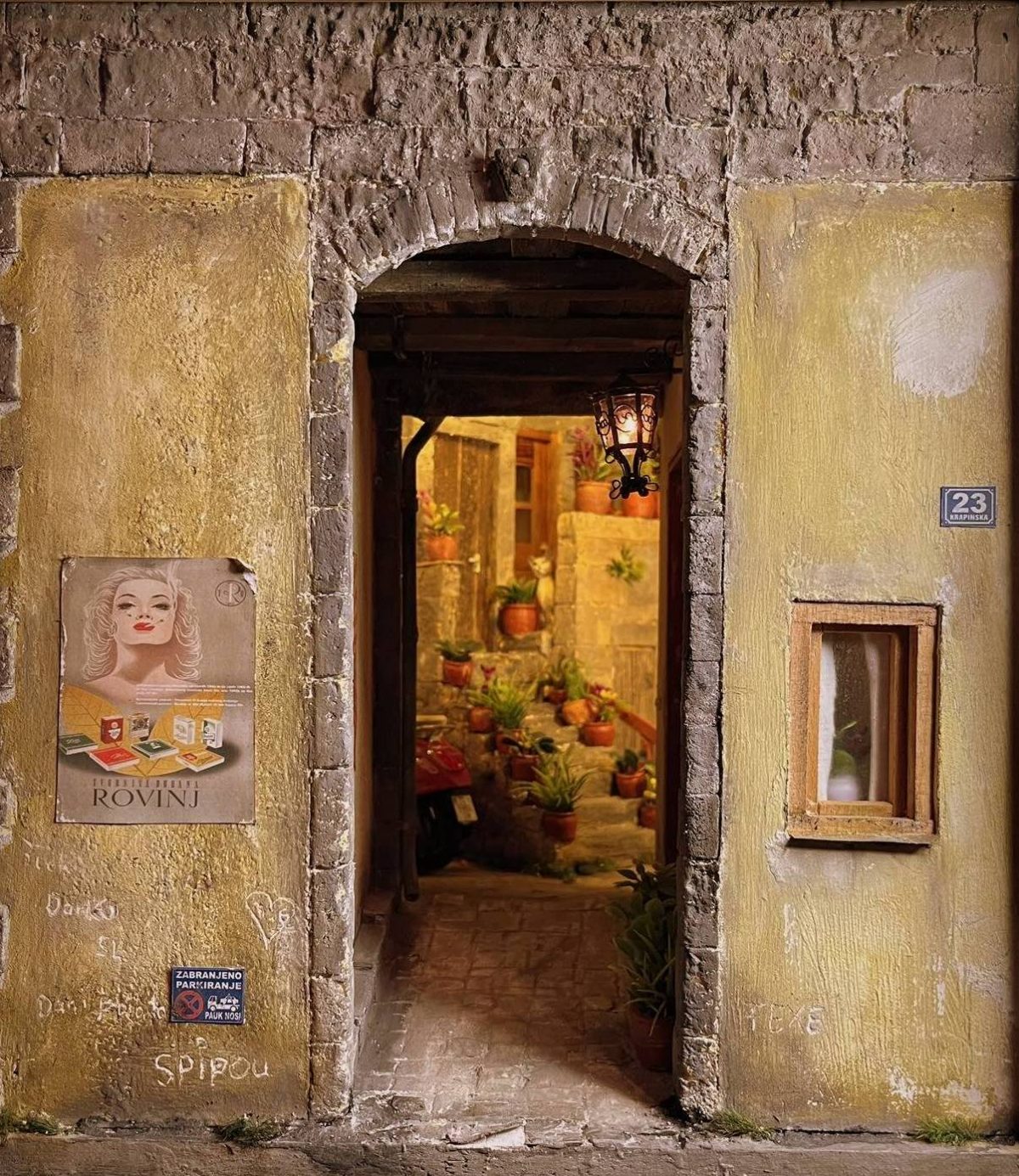 Handgemachtes Diorama – Rovinj (Kroatien) – einzigartiges Sammlerstück Zum Verkauf steht ein detailreiches Diorama des malerischen Urlaubsortes Rovinj in Kroatien. Das Modell wurde nach einem Originalfoto gebaut und mit viel Liebe zum Detail gefertigt. Es zeigt eine typische Altstadtgasse mit Vespa, Pflanzentöpfen, Katzenfigur und idyllischem Hinterhof. 🔹 Maße: ca. 52 x 37 x 35 cm 🔹 Zustand: sehr gut, handgefertigt …