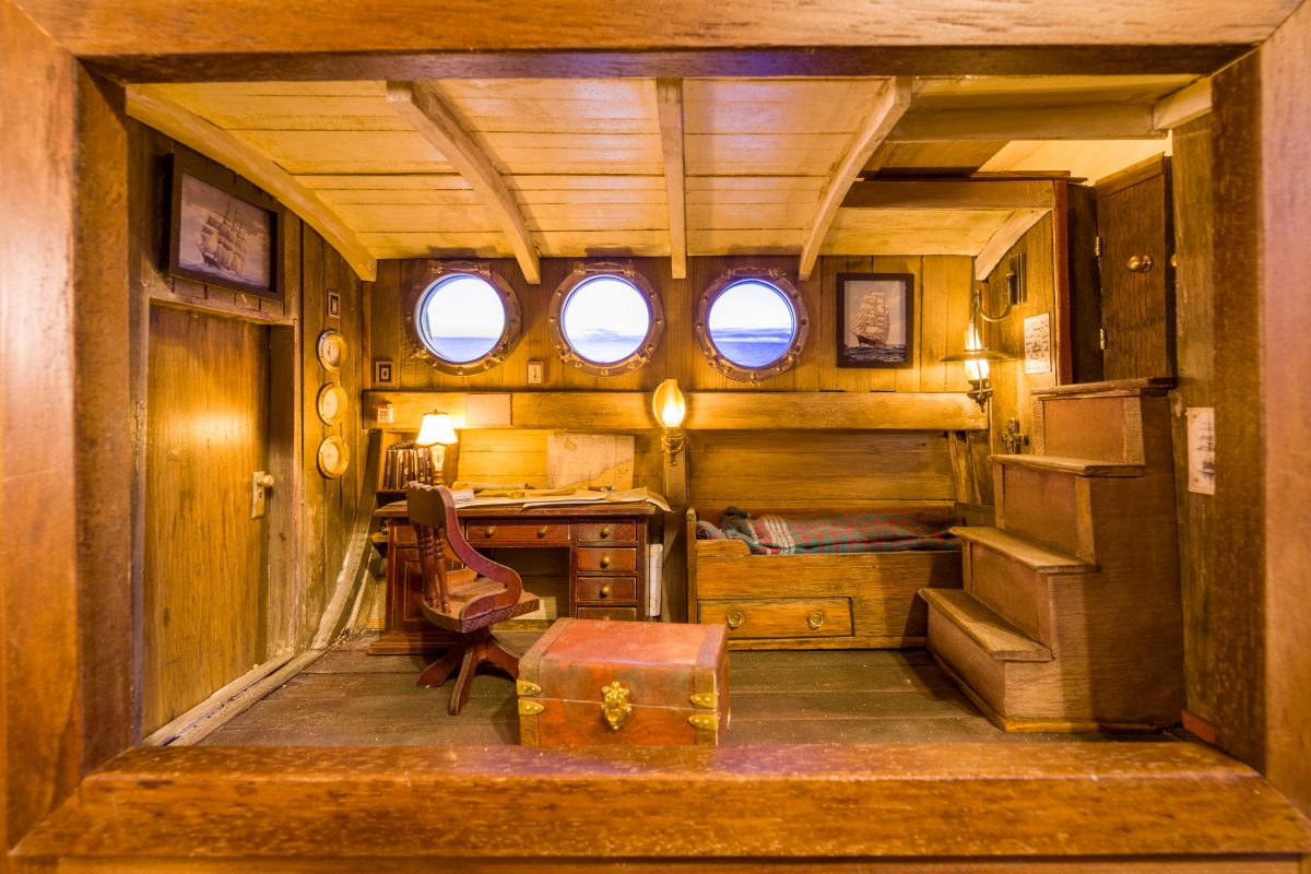 Diese Miniatur zeigt eine maritime Koje, wie sie einst tief im Inneren eines Segelschiffes zu finden war – ein persönlicher Rückzugsort fernab von Hafen und Heimat. Gedämpftes Lampenlicht taucht den Raum in warme Töne. Durch die runden Bullaugen öffnet sich der Blick auf das Meer und den fernen Horizont. Im Hintergrund befindet sich ein Bildschirm, der das Meer abbildet und …