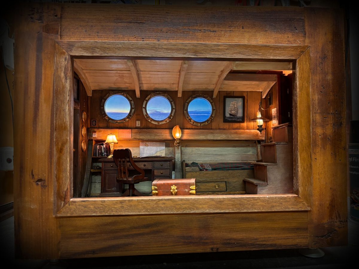 Diese Miniatur zeigt eine maritime Koje, wie sie einst tief im Inneren eines Segelschiffes zu finden war – ein persönlicher Rückzugsort fernab von Hafen und Heimat. Gedämpftes Lampenlicht taucht den Raum in warme Töne. Durch die runden Bullaugen öffnet sich der Blick auf das Meer und den fernen Horizont. Im Hintergrund befindet sich ein Bildschirm, der das Meer abbildet und …