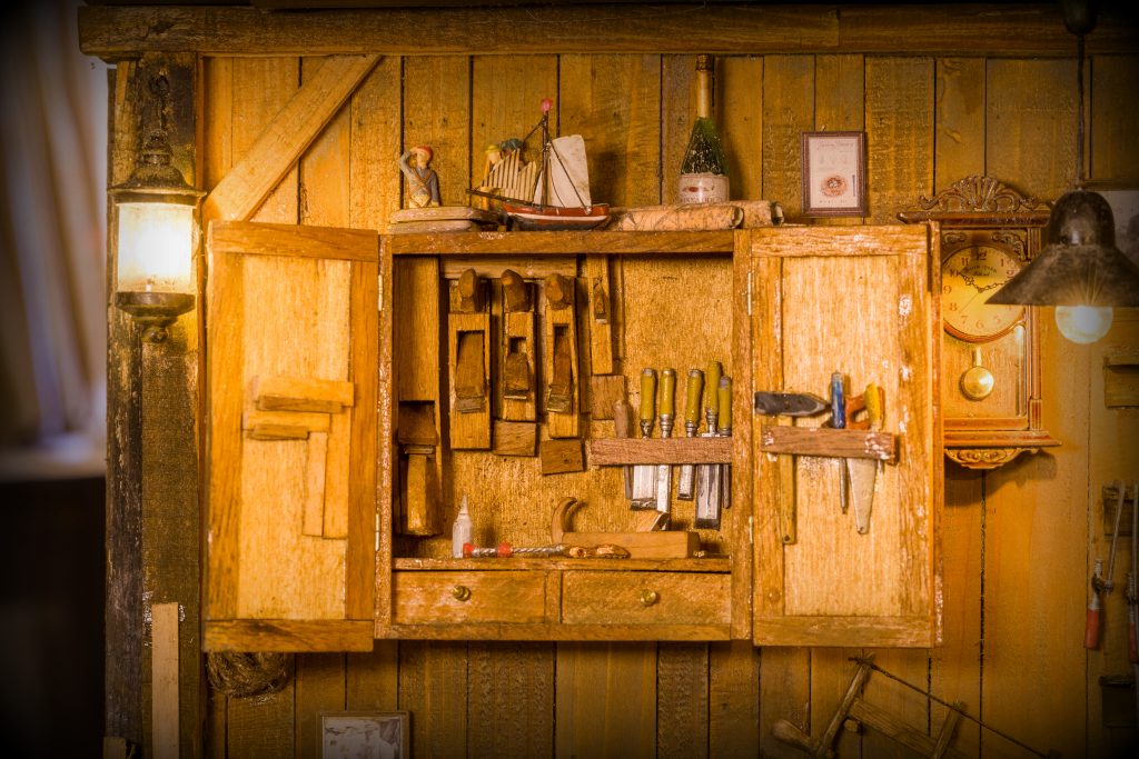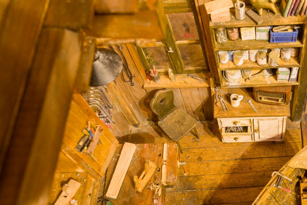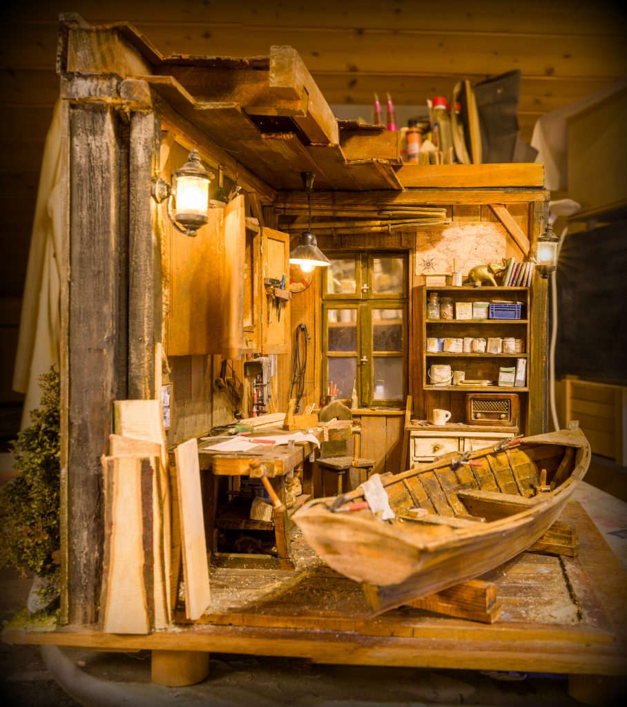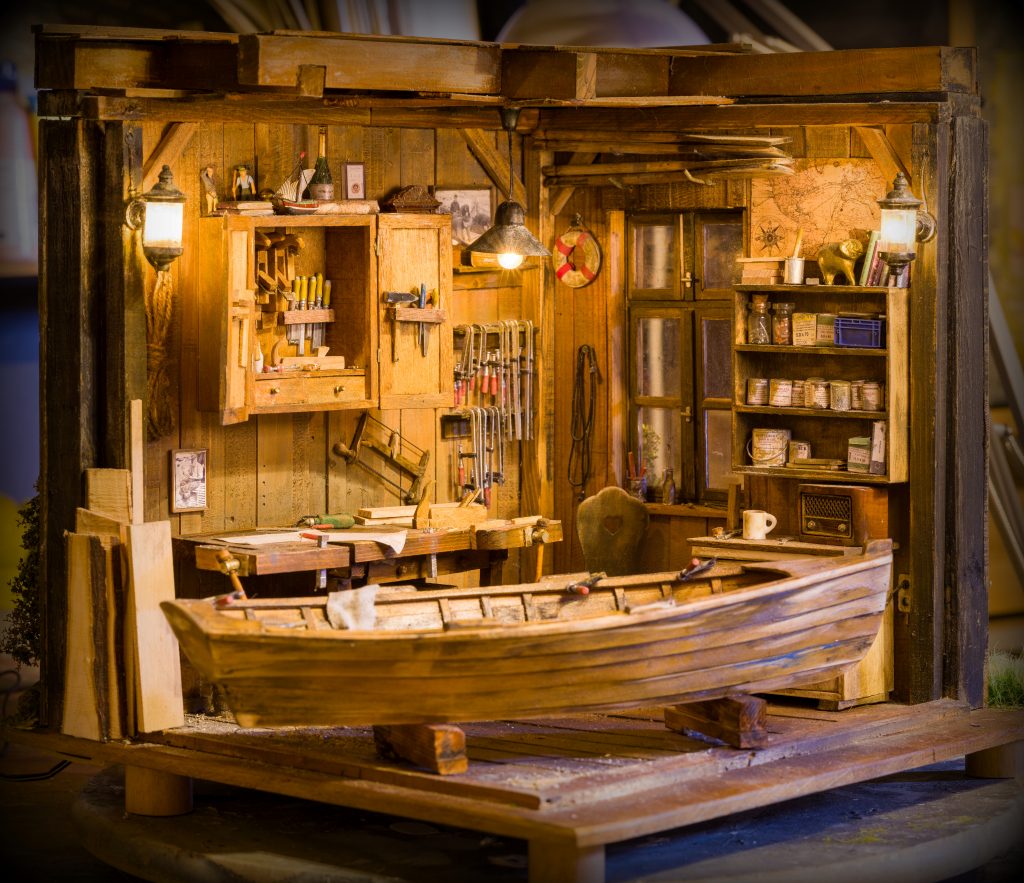 Dieses Diorama ist eine Hommage an das leise, konzentrierte Handwerk vergangener Tage. Es zeigt den Innenraum einer alten Bootsbauer-Werkstatt – einen Ort, an dem Erfahrung, Geduld und Respekt vor dem Bestehenden im Mittelpunkt stehen.
